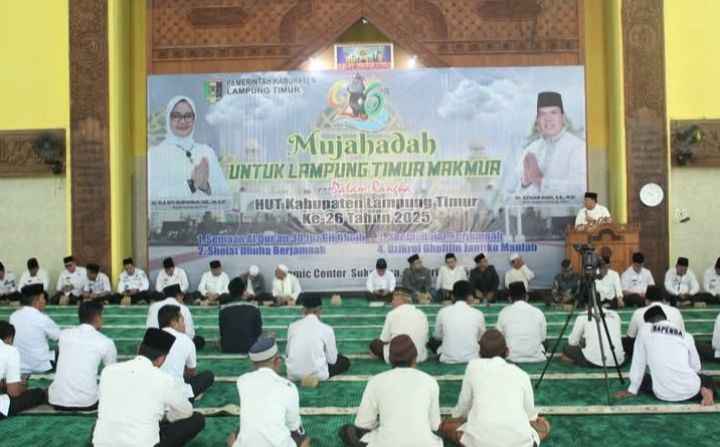 LAMPUNG TIMUR — Dalam rangka memperingati HUT Kabupaten Lampung Timur ke 26 tahun 2025, Pemerintah Kabupaten Lampung Timur menggelar Mujahadah dan Do’a Bersama untuk lampung Timur Makmur, acara yang berlangsung di Masjid Agung Baiturrahman Islamic Center Sukadana, Rabu (23 april 2025).