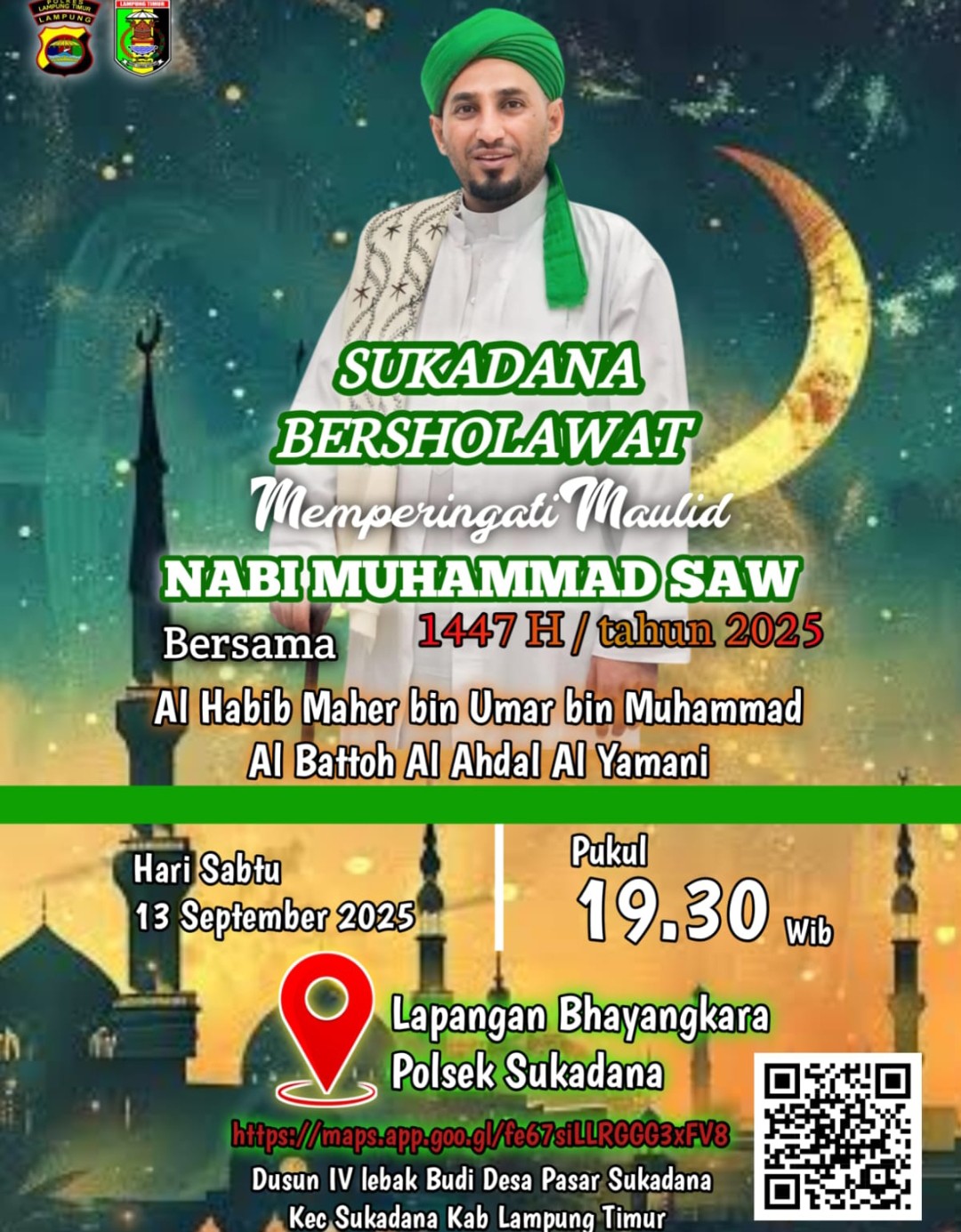 Acara dalam rangka peringatan Maulid Nabi Muhammad SAW 1447 H itu menghadirkan Al Habib Maher bin Umar bin Muhammad Al Batyoh Al Ahdal Al Yamani dan diiringi Hadroh Subhanur Wudha dari Nambah Dadi, Terbanggi Besar Lampung Tengah.